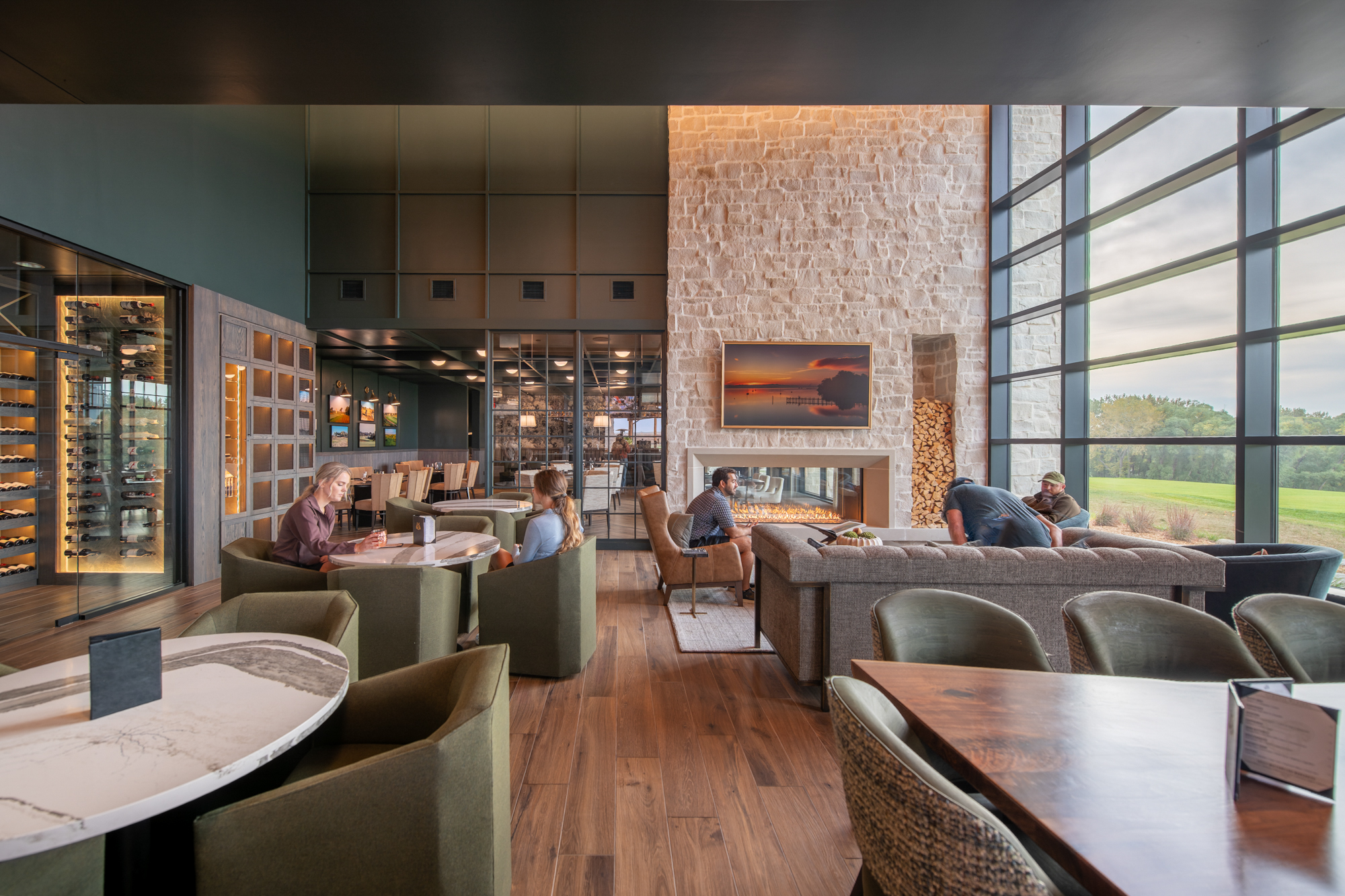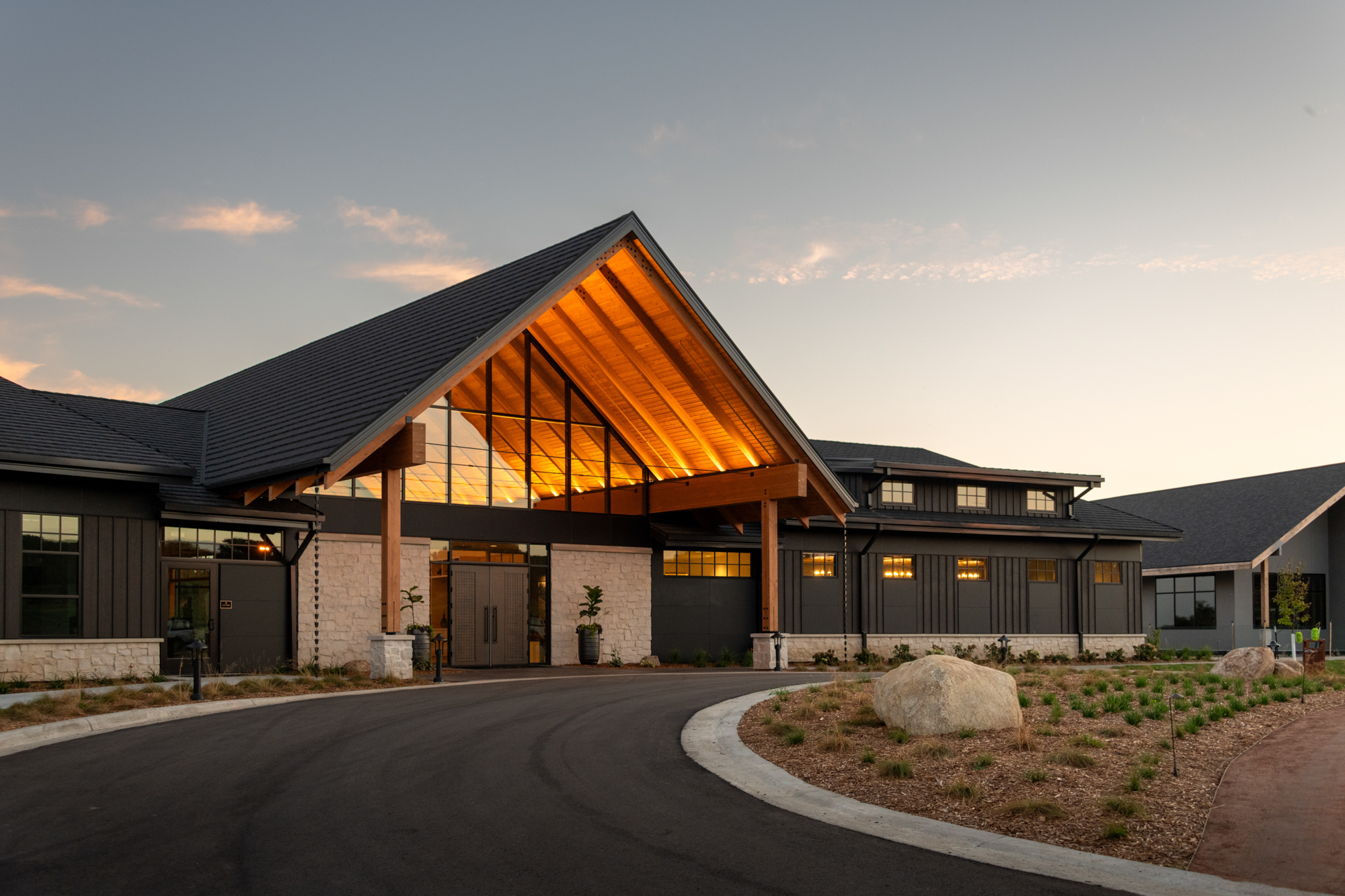 The clubhouse boasts the language of a timeless lodge. Cedar siding, glulam structure, and stone accents feel familiar yet sophisticated. The structure also serves to reflect indirect light within the central void, creating a unique glowing target just behind the 18th green at dusk.