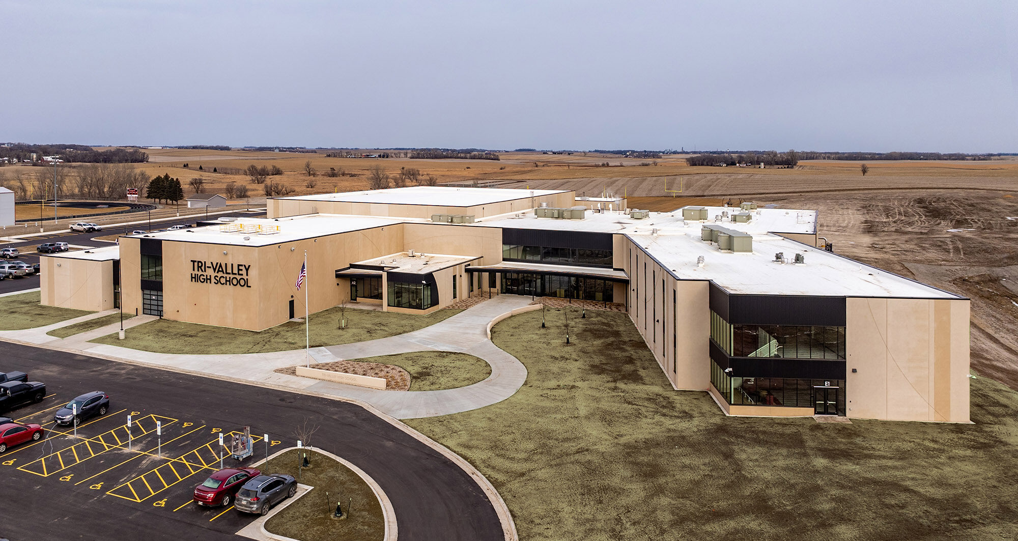 This project was funded by the same bond as the new Tri-Valley Elementary School in Crooks, demonstrating a proactive approach to growth management in the district. The high-quality academic, social, athletic, and performing arts spaces in this new high school also demonstrate the district’s commitment to giving its students the very best resources for success in school and beyond. With ~300 enrolled upon opening, there’s room for another 200 next year. Just in case you’re shopping around.